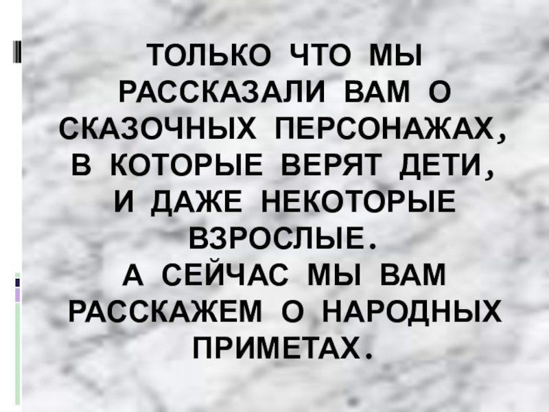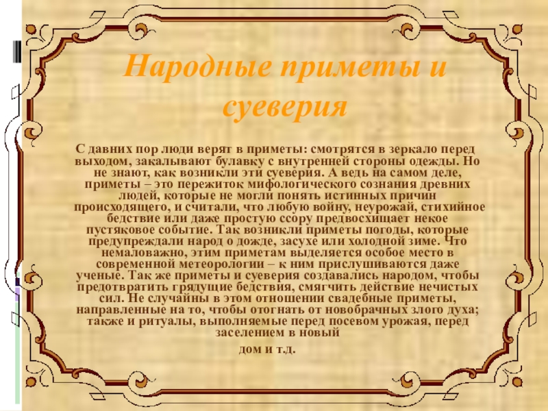 в зеркало перед выходом, закалывают булавку с внутренней стороны одежды. Но не знают, как возникли эти суеверия. А ведь на самом деле, приметы – это пережиток мифологического сознания древних людей, которые не могли понять истинных причин происходящего, и считали, что любую войну, неурожай, стихийное бедствие или даже простую ссору предвосхищает некое пустяковое событие. Так возникли приметы погоды, которые предупреждали народ о дожде, засухе или холодной зиме. Что немаловажно, этим приметам выделяется особое место в современной метеорологии – к ним прислушиваются даже ученые. Так же приметы и суеверия создавались народом, чтобы предотвратить грядущие бедствия, смягчить действие нечистых сил. Не случайны в этом отношении свадебные приметы, направленные на то, чтобы отогнать от новобрачных злого духа; также и ритуалы, выполняемые перед посевом урожая, перед заселением в новый