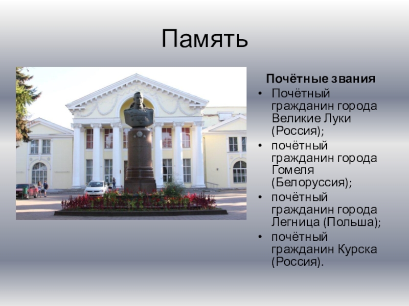Общевойсковой академии Вооружённых Сил Российской Федерации), Калининграде, Пскове, Бресте, Гомеле, Чернигове, Минске (в школе им. Рокоссовского).