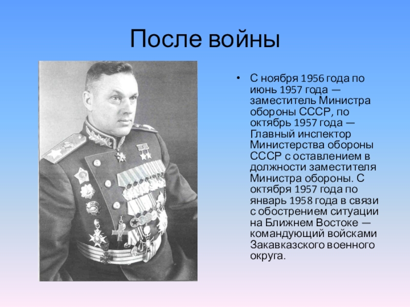 обороны СССР, по октябрь 1957 года — Главный инспектор Министерства обороны СССР с оставлением в должности заместителя Министра обороны. С октября 1957 года по январь 1958 года в связи с обострением ситуации на Ближнем Востоке — командующий войсками Закавказского военного округа.