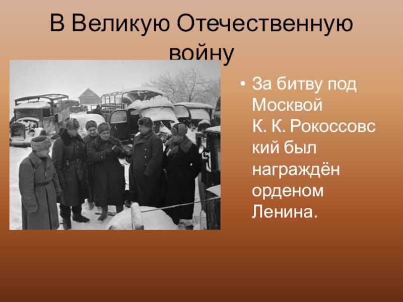 Слайд 16За битву под Москвой К. К. Рокоссовский был награждён орденом Ленина.