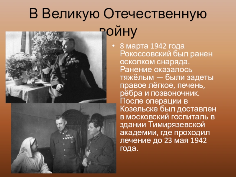 Слайд 178 марта 1942 года Рокоссовский был ранен осколком снаряда. Ранение оказалось