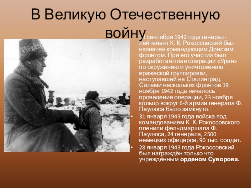 28 января 1943 года Рокоссовский был награждён только что учреждённым орденом Суворова.
