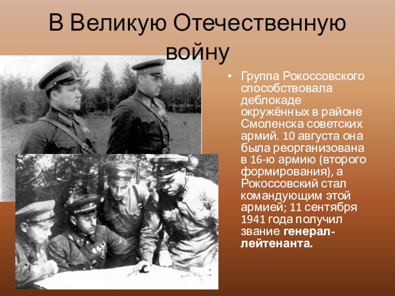 августа она была реорганизована в 16-ю армию (второго формирования), а Рокоссовский стал командующим этой армией; 11 сентября 1941 года получил звание генерал-лейтенанта.