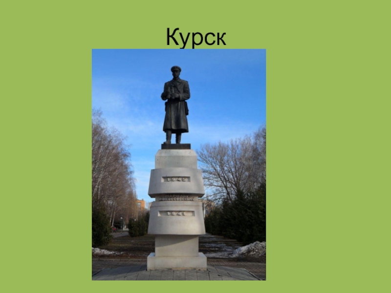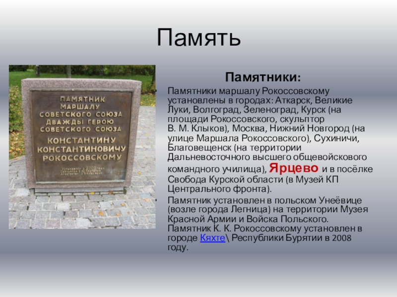 Памятники маршалу Рокоссовскому установлены в городах: Аткарск, Великие Луки, Волгоград, Зеленоград,
