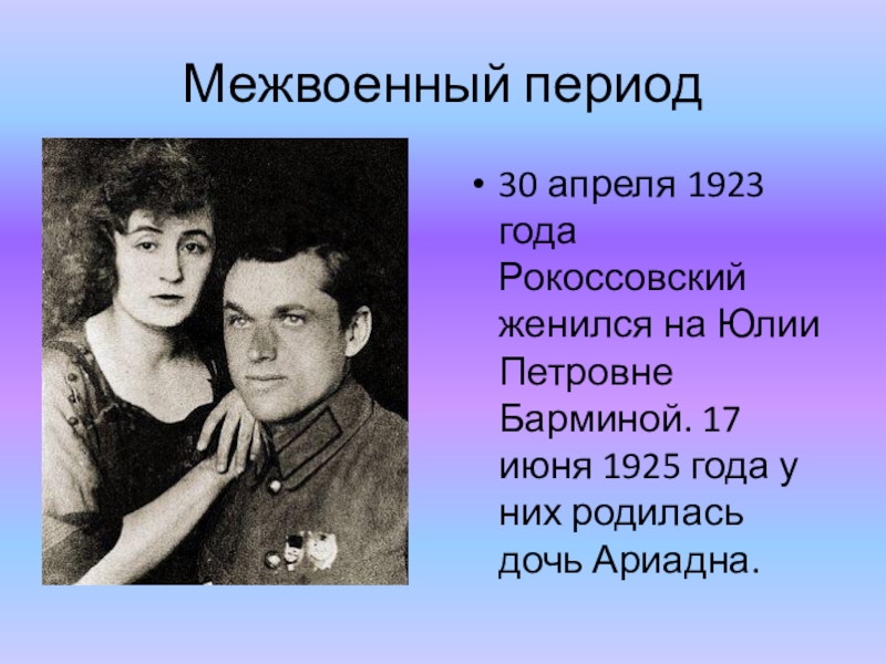 30 апреля 1923 года Рокоссовский женился на Юлии Петровне Барминой.