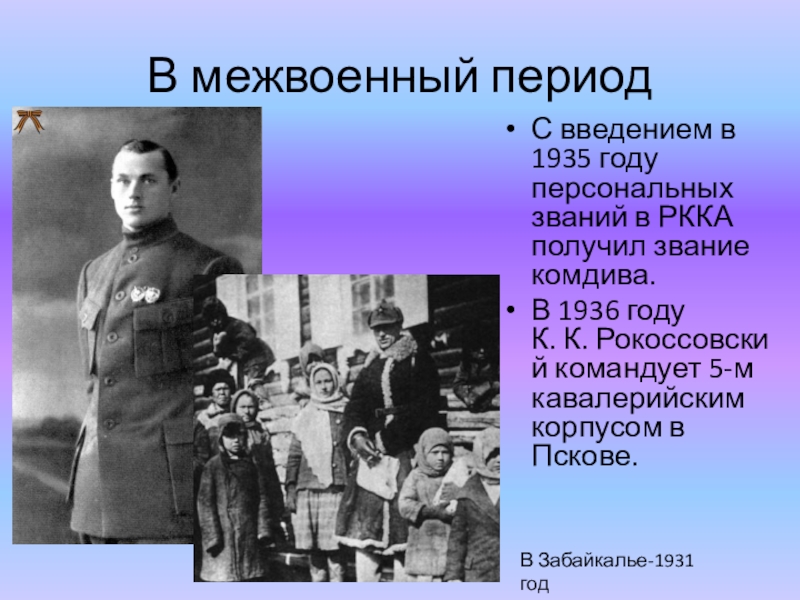В 1936 году К. К. Рокоссовский командует 5-м кавалерийским корпусом в Пскове.