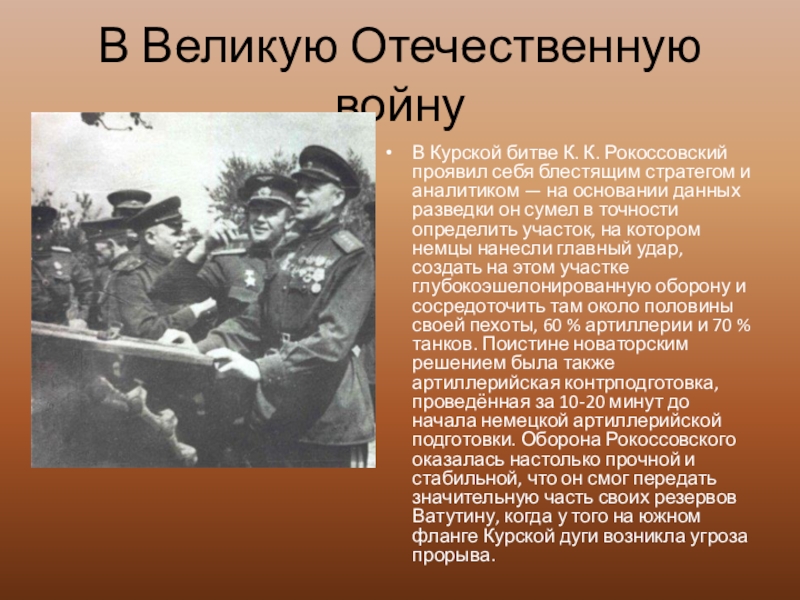 Слайд 19В Курской битве К. К. Рокоссовский проявил себя блестящим стратегом и аналитиком — на