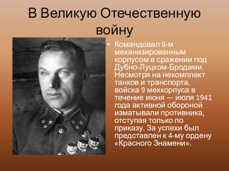 Командовал 9-м механизированным корпусом в сражении под Дубно-Луцком-Бродами.