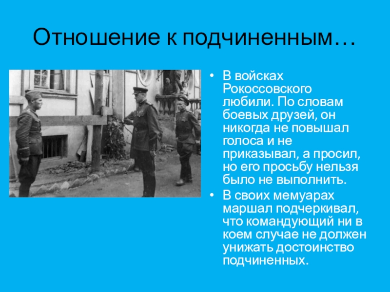 В своих мемуарах маршал подчеркивал, что командующий ни в коем случае не должен унижать достоинство подчиненных.