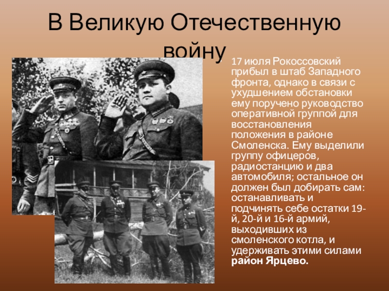 с ухудшением обстановки ему поручено руководство оперативной группой для восстановления положения в районе Смоленска. Ему выделили группу офицеров, радиостанцию и два автомобиля; остальное он должен был добирать сам: останавливать и подчинять себе остатки 19-й, 20-й и 16-й армий, выходивших из смоленского котла, и удерживать этими силами район Ярцево.