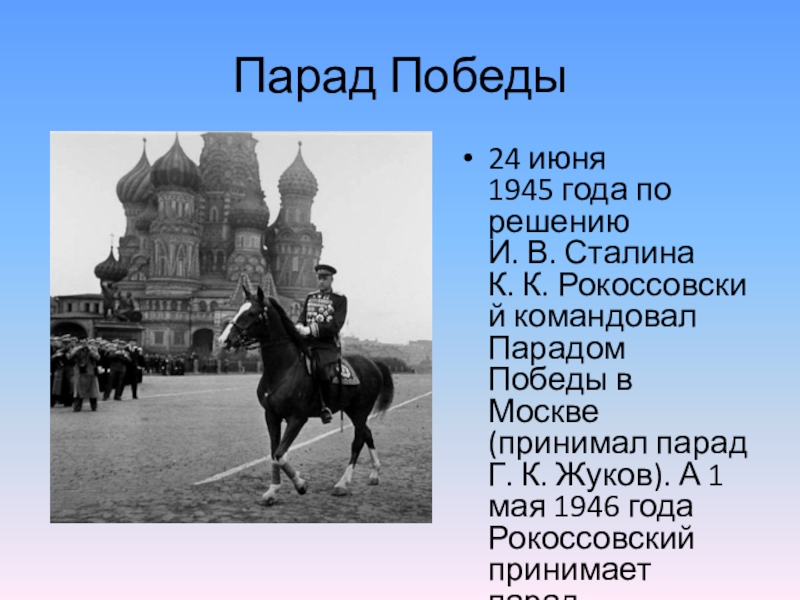 24 июня 1945 года по решению И. В. Сталина К. К. Рокоссовский командовал Парадом Победы