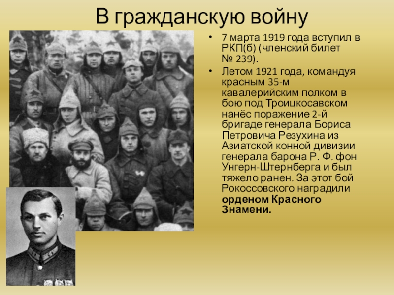 Летом 1921 года, командуя красным 35-м кавалерийским полком в бою под Троицкосавском нанёс поражение 2-й бригаде генерала Бориса Петровича Резухина из Азиатской конной дивизии генерала барона Р. Ф. фон Унгерн-Штернберга и был тяжело ранен. За этот бой Рокоссовского наградили орденом Красного Знамени.