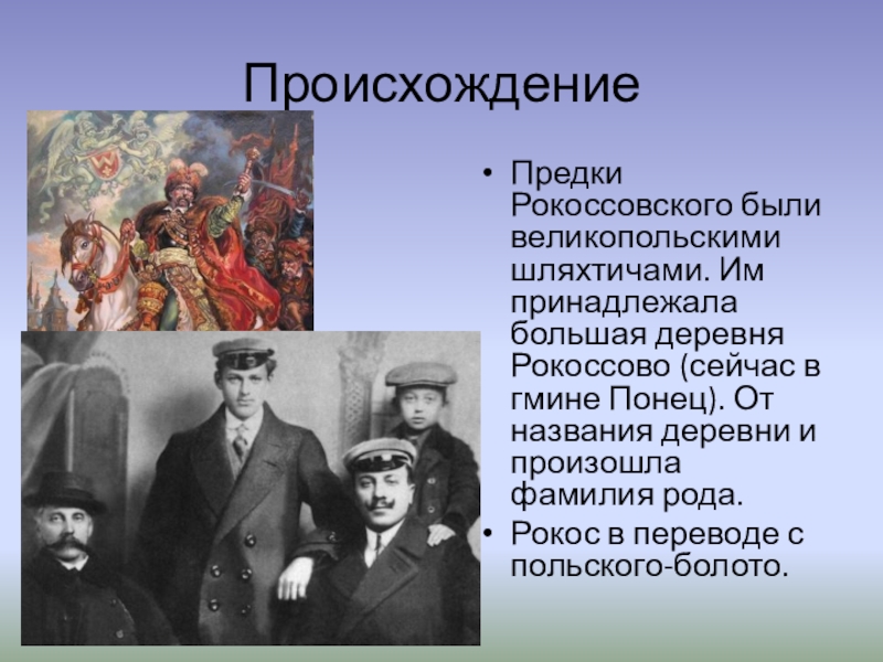 Предки Рокоссовского были великопольскими шляхтичами. Им принадлежала большая деревня Рокоссово (сейчас
