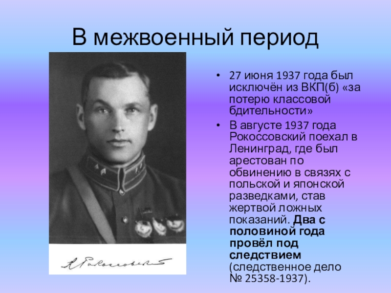 В августе 1937 года Рокоссовский поехал в Ленинград, где был арестован по обвинению в связях с польской и японской разведками, став жертвой ложных показаний. Два с половиной года провёл под следствием (следственное дело № 25358-1937).