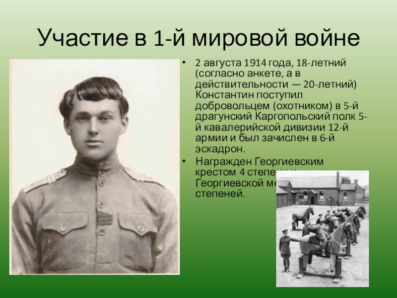 а в действительности — 20-летний) Константин поступил добровольцем (охотником) в 5-й драгунский Каргопольский полк 5-й кавалерийской дивизии 12-й армии и был зачислен в 6-й эскадрон.