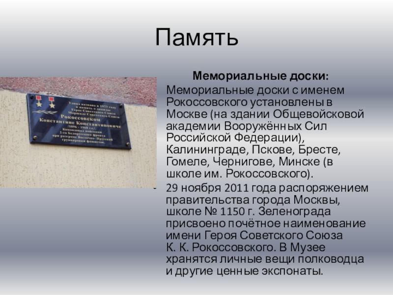Мемориальные доски с именем Рокоссовского установлены в Москве (на здании