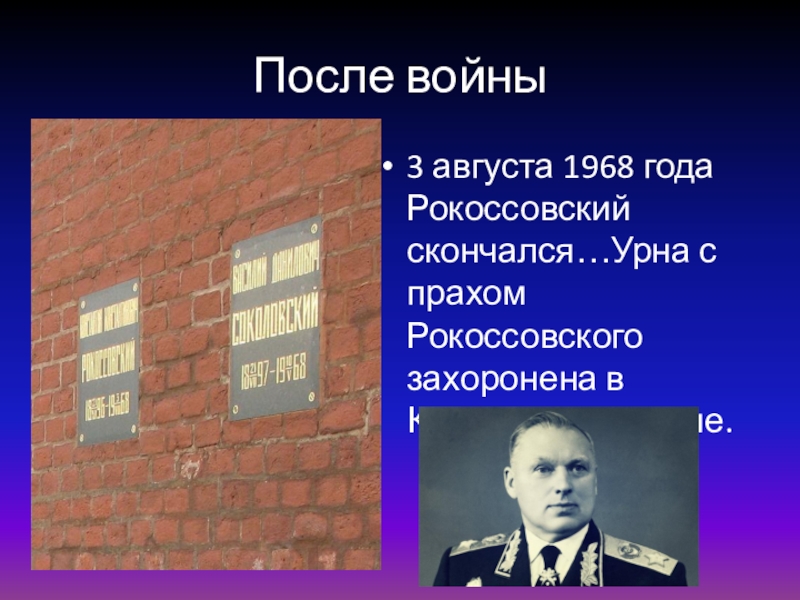 3 августа 1968 года Рокоссовский скончался…Урна с прахом Рокоссовского захоронена
