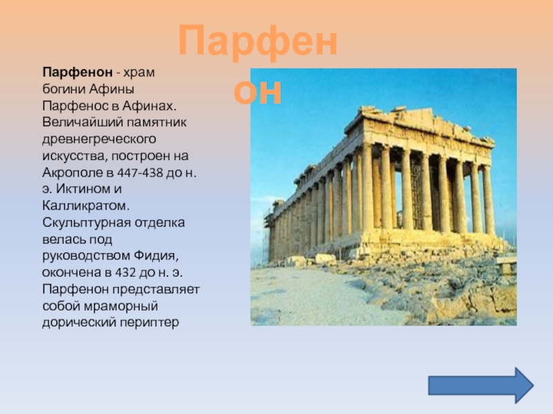 построен на Акрополе в 447-438 до н. э. Иктином и Калликратом. Скульптурная отделка велась под руководством Фидия, окончена в 432 до н. э. Парфенон представляет собой мраморный дорический периптер