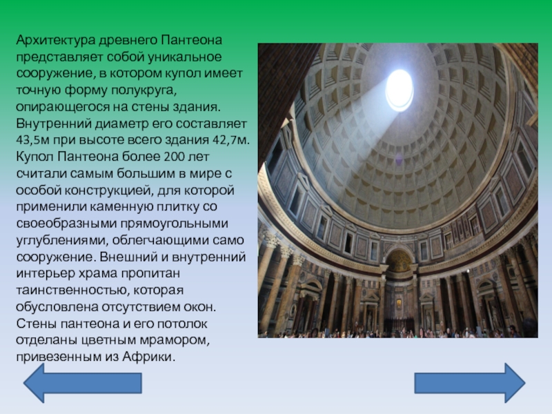 Слайд 3Архитектура древнего Пантеона представляет собой уникальное сооружение, в котором купол имеет