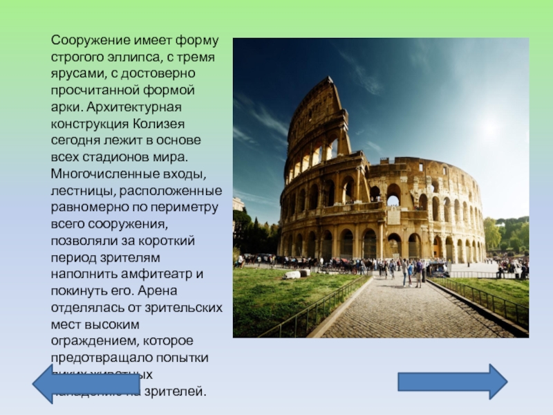 формой арки. Архитектурная конструкция Колизея сегодня лежит в основе всех стадионов мира. Многочисленные входы, лестницы, расположенные равномерно по периметру всего сооружения, позволяли за короткий период зрителям наполнить амфитеатр и покинуть его. Арена отделялась от зрительских мест высоким ограждением, которое предотвращало попытки диких животных нападению на зрителей.