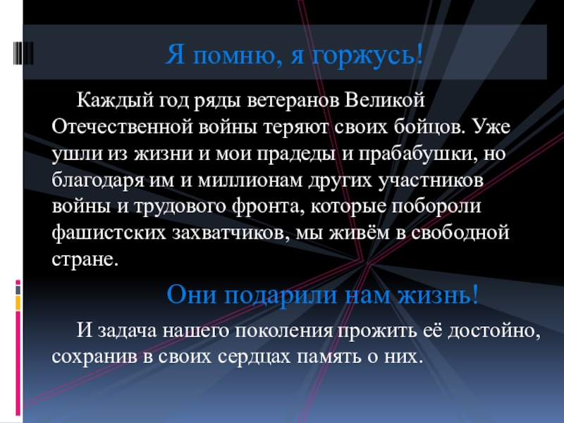 Это сайт презентаций, где можно хранить и обмениваться своими презентациями, докладами, проектами, шаблонами в формате PowerPoint с другими пользователями. Мы помогаем школьникам, студентам, учителям, преподавателям хранить и обмениваться учебными материалами.