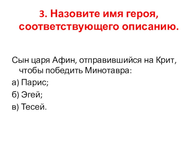 3. Назовите имя героя, соответствующего описанию. Сын царя Афин, отправившийся на Крит, чтобы победить Минотавра:а) Парис;б) Эгей;в)