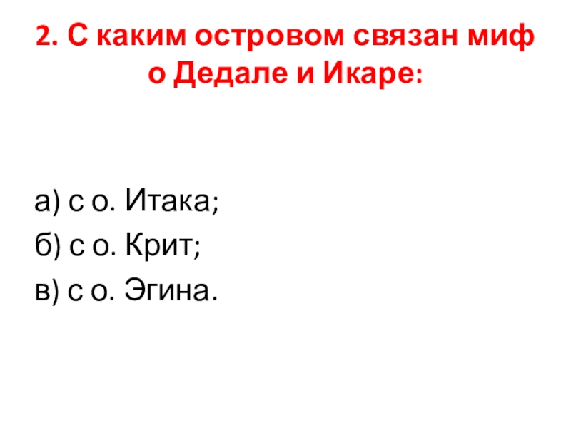 2. С каким островом связан миф о Дедале и Икаре:а) с о. Итака;б) с о. Крит;в) с