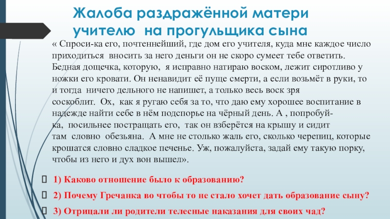 « Спроси-ка его, почтеннейший, где дом его учителя, куда мне каждое число приходиться вносить за него деньги он не скоро сумеет тебе ответить. Бедная дощечка, которую, я исправно натираю воском, лежит сиротливо у ножки его кровати. Он ненавидит её пуще смерти, а если возьмёт в руки, то и тогда ничего дельного не напишет, а только весь воск зря соскоблит. Ох, как я ругаю себя за то, что даю ему хорошее воспитание в надежде найти себе в нём подспорье на чёрный день. А , попробуй-ка, посильнее постращать его, так он взберётся на крышу и сидит там словно обезьяна. А мне не столько жаль его, сколько черепиц, которые крошатся словно сладкое печенье. Уж, пожалуйста, задай ему такую порку, чтобы из него и дух вон вышел».
