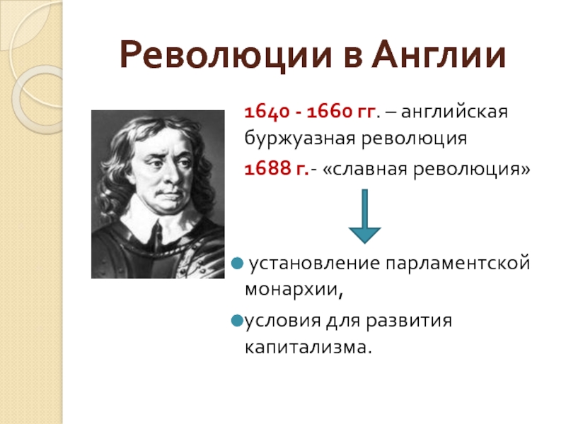 Революции в Англии1640 - 1660 гг. – английская буржуазная революция1688 г.- «славная революция» установление парламентской монархии,условия для