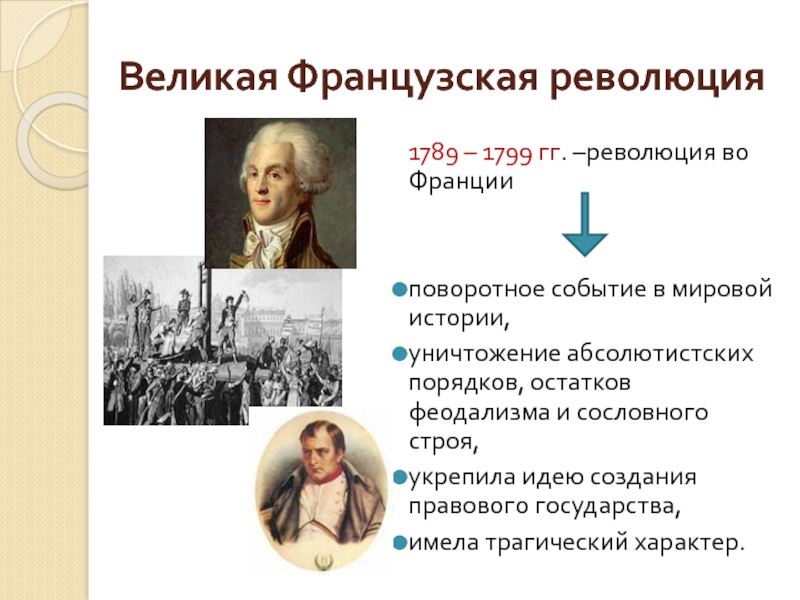 Великая Французская революция1789 – 1799 гг. –революция во Францииповоротное событие в мировой истории,уничтожение абсолютистских порядков, остатков феодализма