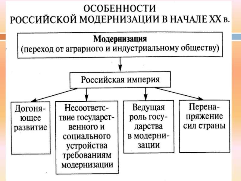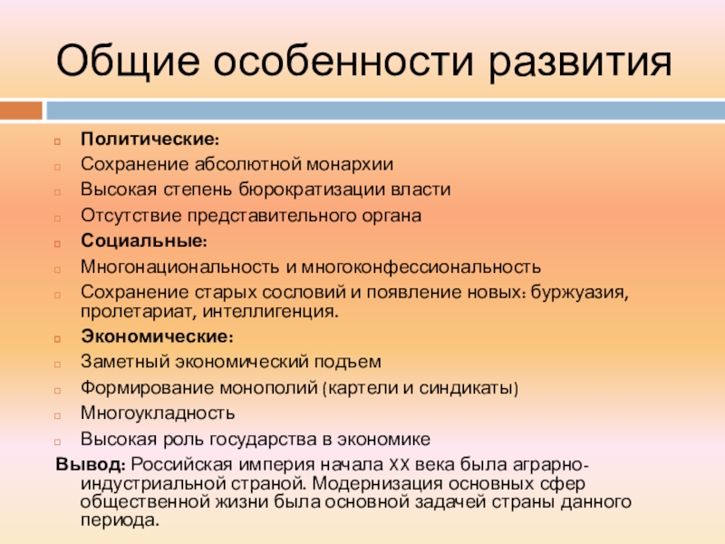 Вывод: Российская империя начала XX века была аграрно-индустриальной страной. Модернизация основных сфер общественной жизни была основной задачей страны данного периода.