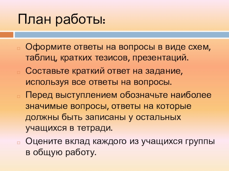 Перед выступлением обозначьте наиболее значимые вопросы, ответы на которые должны быть записаны у остальных учащихся в тетради.
