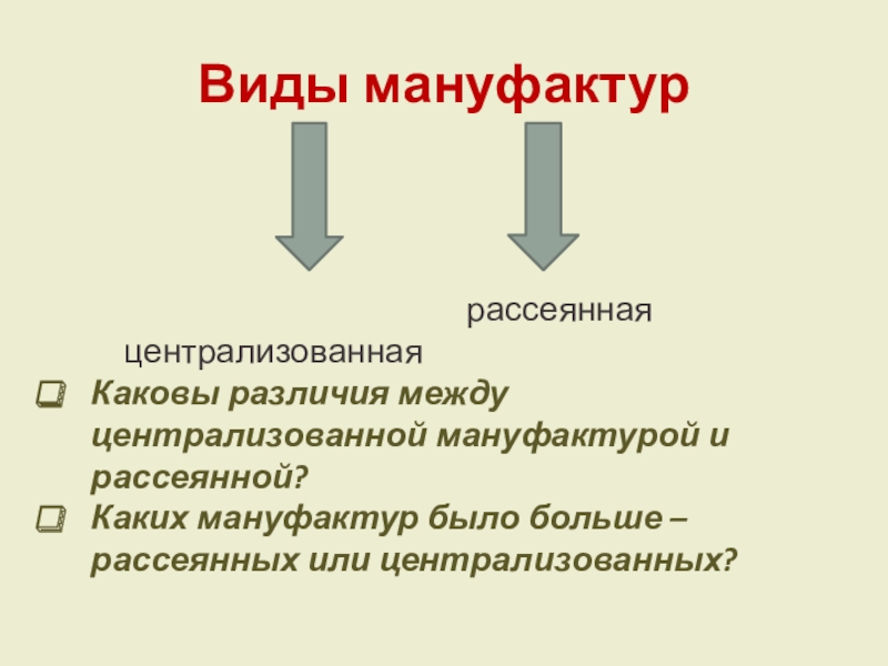 Виды мануфактур централизованнаярассеяннаяКаковы различия между централизованной мануфактурой и рассеянной?Каких мануфактур было больше – рассеянных или централизованных?
