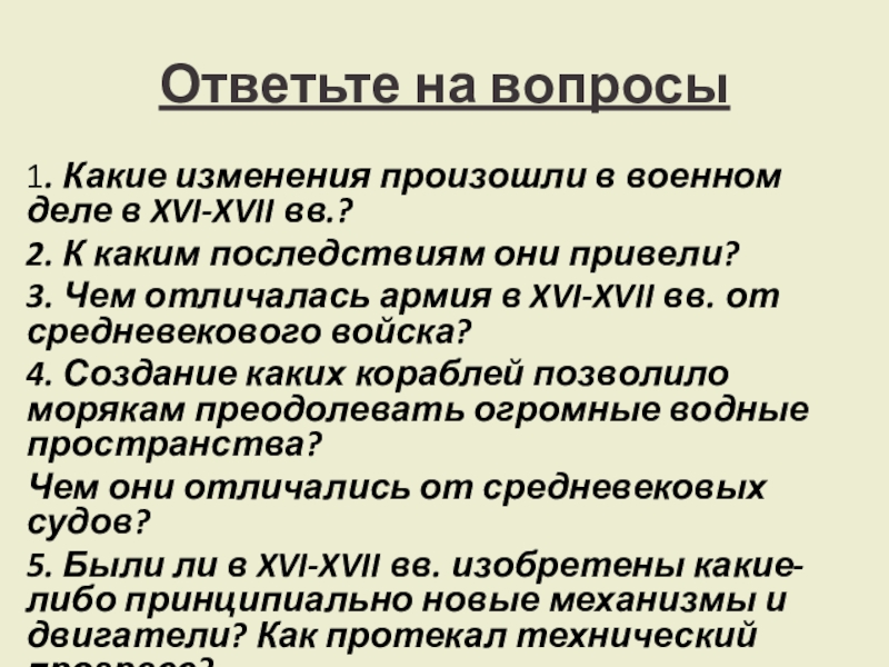 Ответьте на вопросы1. Какие изменения произошли в военном деле в XVI-XVII вв.?2. К каким последствиям они привели?3.