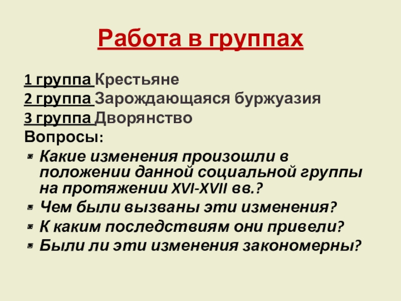 Работа в группах1 группа Крестьяне 2 группа Зарождающаяся буржуазия3 группа ДворянствоВопросы:Какие изменения произошли в положении данной социальной