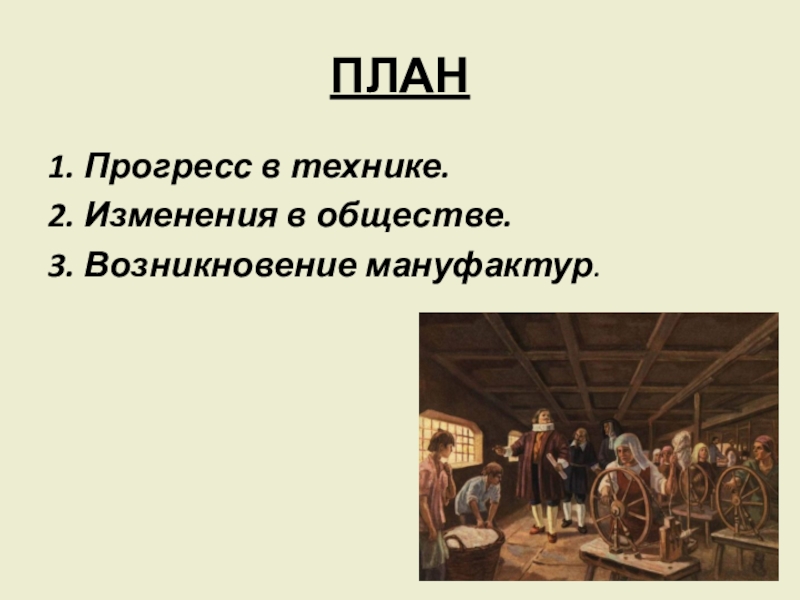 ПЛАН1. Прогресс в технике.2. Изменения в обществе.3. Возникновение мануфактур.