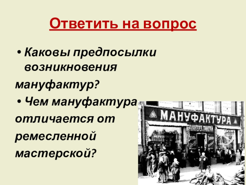 Ответить на вопросКаковы предпосылки возникновениямануфактур?Чем мануфактура отличается от   ремесленной мастерской?