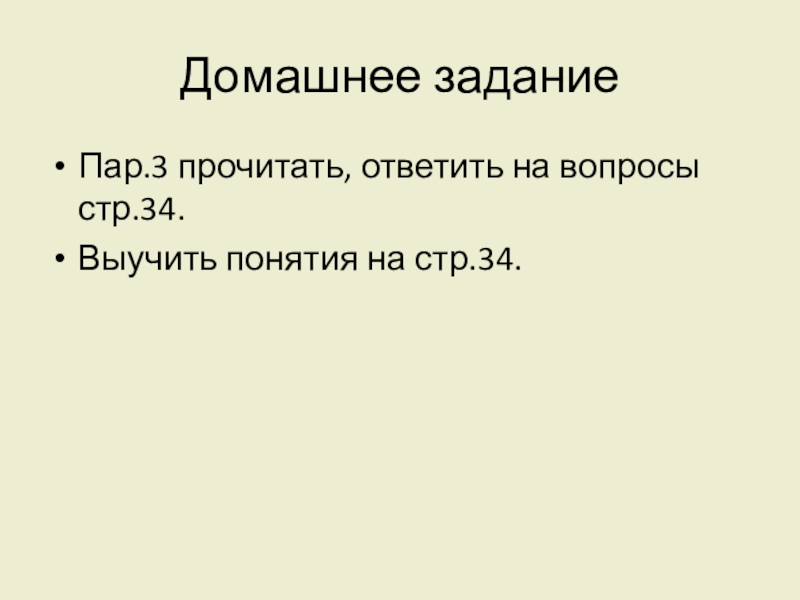 Домашнее заданиеПар.3 прочитать, ответить на вопросы стр.34.Выучить понятия на стр.34.