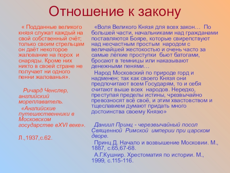 «Воля Великого Князя для всех закон… По большей части, начальниками над гражданами поставляются Бояре, которые свирепствуют над несчастным простым народом с величайшей жестокостью и очень часто за самые лёгкие проступки бьют батогами, бросают в темницы или наказывают денежными пенями…