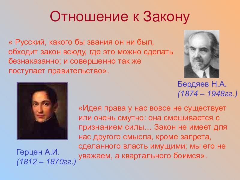 «Идея права у нас вовсе не существует или очень смутно: она смешивается с признанием силы… Закон не имеет для нас другого смысла, кроме запрета, сделанного власть имущими; мы его не уважаем, а квартального боимся».