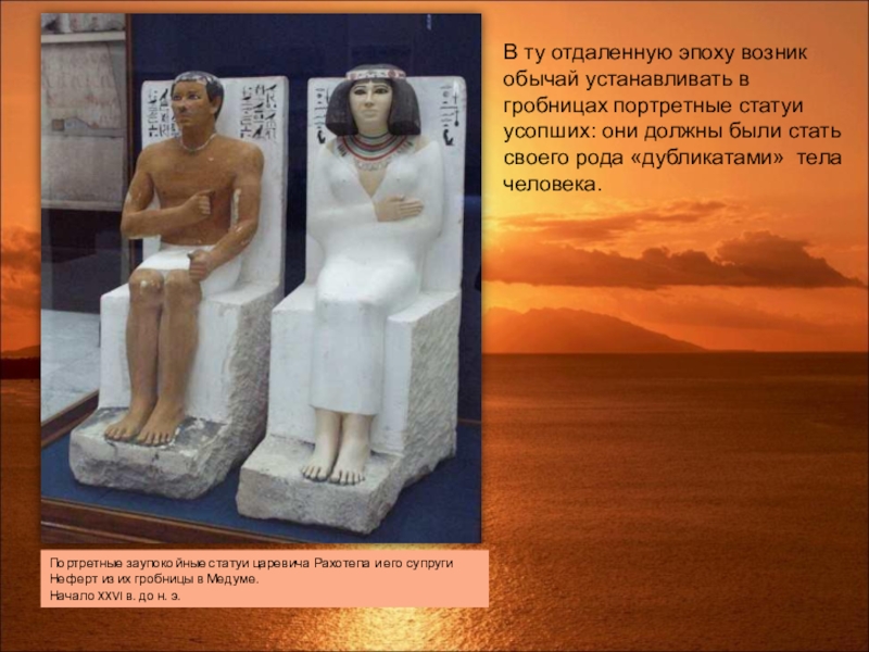Портретные заупокойные статуи царевича Рахотепа и его супруги Неферт из их гробницы в Медуме.