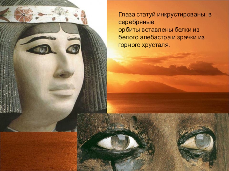 Глазница - медь. Белок - алебастр. Радужка - горный хрусталь. В хрустале выточен конус, заполненный сажей, который имитирует зрачок и сам взгляд.