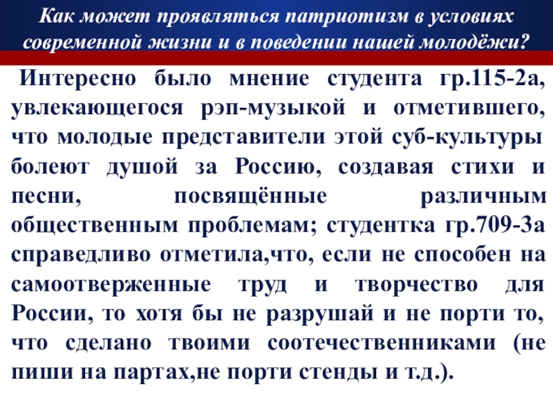 Интересно было мнение студента гр.115-2а, увлекающегося рэп-музыкой и отметившего, что молодые представители этой суб-культуры болеют душой за Россию, создавая стихи и песни, посвящённые различным общественным проблемам; студентка гр.709-3а справедливо отметила,что, если не способен на самоотверженные труд и творчество для России, то хотя бы не разрушай и не порти то, что сделано твоими соотечественниками (не пиши на партах,не порти стенды и т.д.).