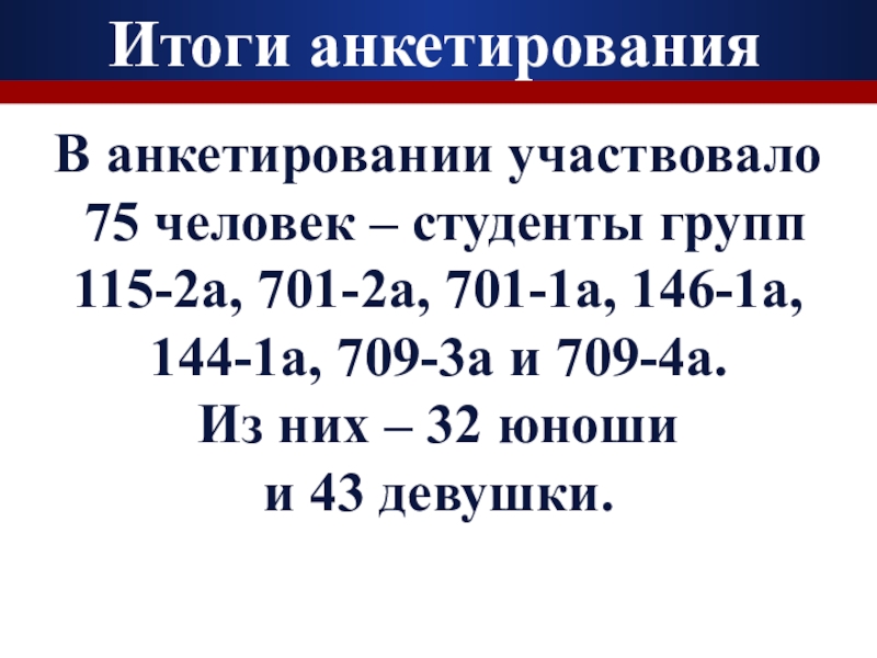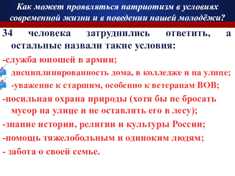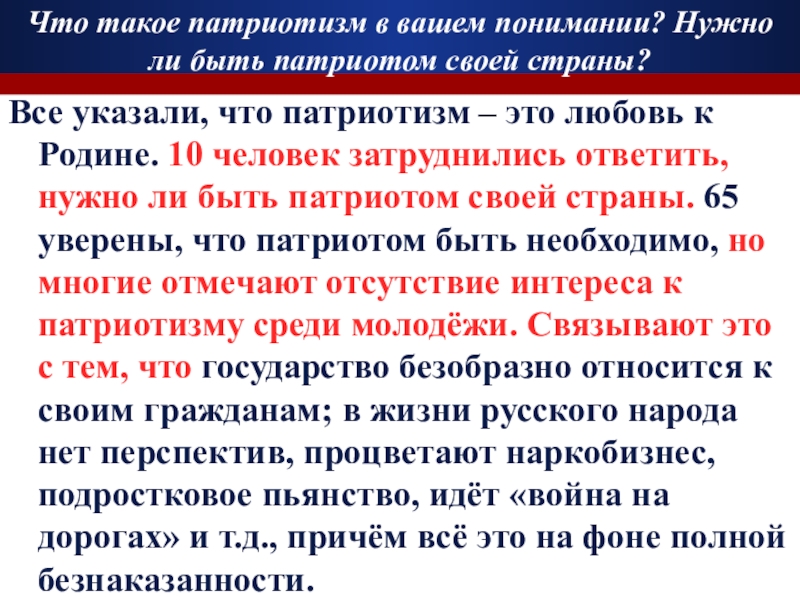 Все указали, что патриотизм – это любовь к Родине. 10 человек затруднились ответить, нужно ли быть патриотом своей страны. 65 уверены, что патриотом быть необходимо, но многие отмечают отсутствие интереса к патриотизму среди молодёжи. Связывают это с тем, что государство безобразно относится к своим гражданам; в жизни русского народа нет перспектив, процветают наркобизнес, подростковое пьянство, идёт «война на дорогах» и т.д., причём всё это на фоне полной безнаказанности.