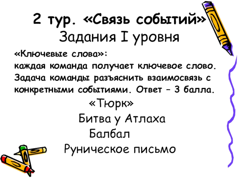 2 тур. «Связь событий»  Задания I уровня«Ключевые слова»: каждая команда получает ключевое слово.Задача команды разъяснить взаимосвязь
