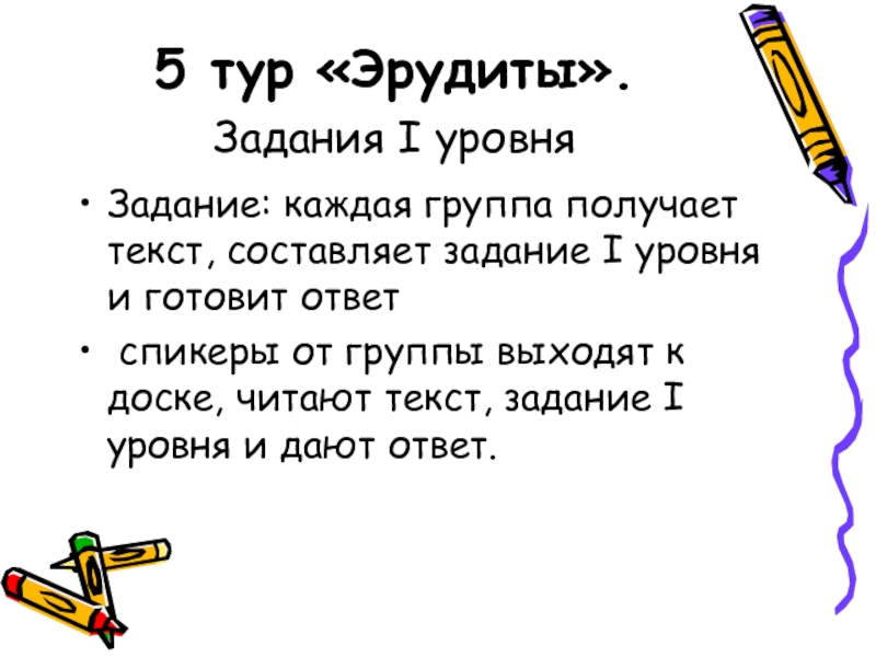 5 тур «Эрудиты». Задания I уровня Задание: каждая группа получает текст, составляет задание I уровня и готовит