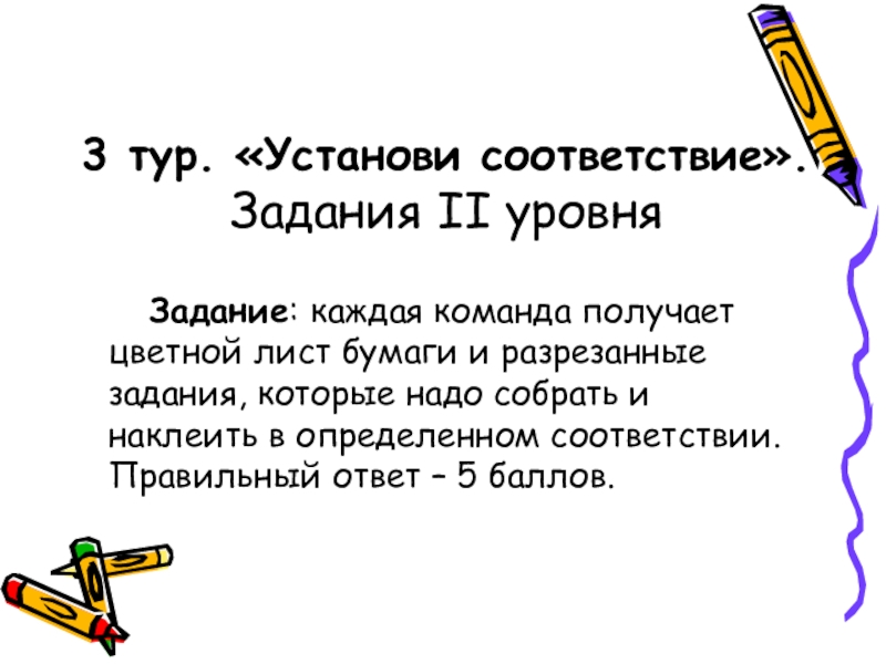 3 тур. «Установи соответствие».  Задания II уровня     Задание: каждая команда получает цветной
