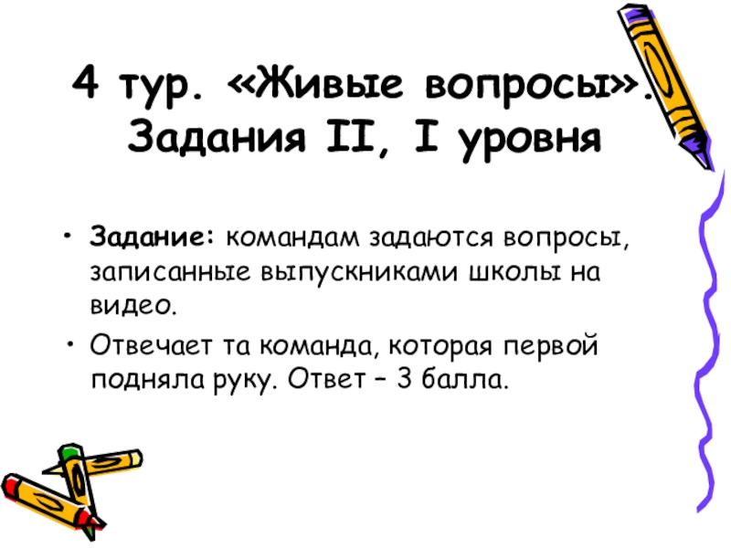 4 тур. «Живые вопросы». Задания II, I уровняЗадание: командам задаются вопросы, записанные выпускниками школы на видео.Отвечает та