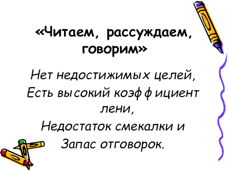 «Читаем, рассуждаем, говорим»Нет недостижимых целей,Есть высокий коэффициент лени,Недостаток смекалки иЗапас отговорок.