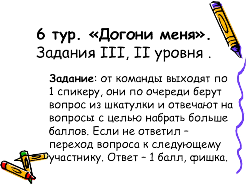 6 тур. «Догони меня». Задания III, II уровня .  Задание: от команды выходят по 1 спикеру,
